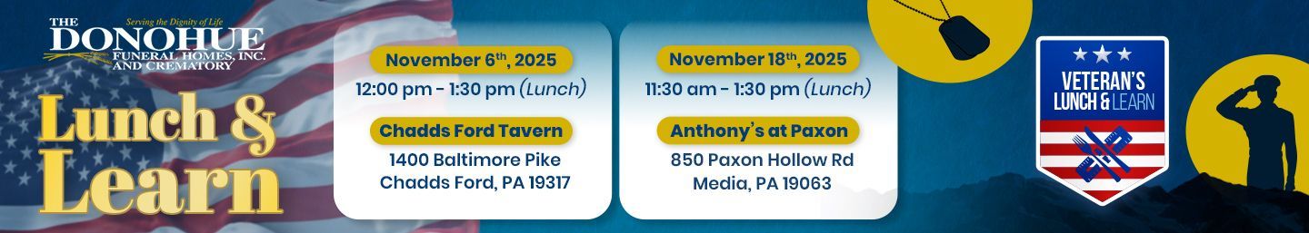 The Donohue Funeral Home is proud to offer FREE Dine & Learn to answer your questions about Pre-Planning, Medicaid, Irrevocable Assignments, Veteran Benefits, Social Security, etc.