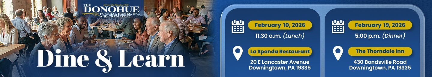 The Donohue Funeral Home is proud to offer FREE Dine & Learn to answer your questions about Pre-Planning, Medicaid, Irrevocable Assignments, Veteran Benefits, Social Security, etc.